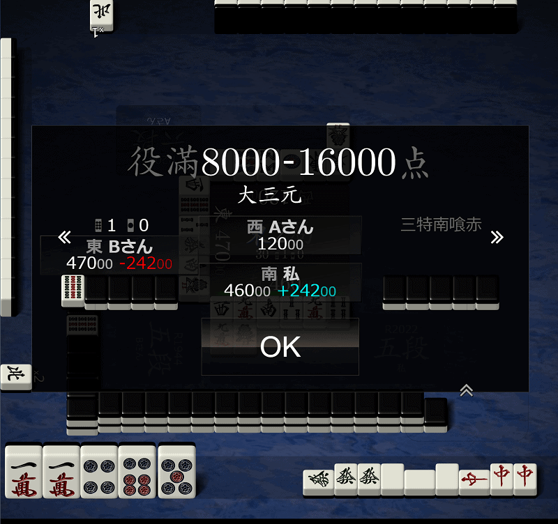 あとは天鳳特有のルール(ヨンマも含め)で、完全順位制です。